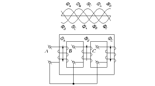 Рис.1.26. Трехфазный трансформатор, состоящий из трех однофазных