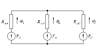 На каждый из стержней магнитопровода наматывается одна первичная обмотка и одна или несколько вторичных обмоток трансформатора. Магнитное сопротивление отличается от магнитных сопротивлений и (рис. 1.27б), что приводит к некоторой асимметрии намагничивающих токов. Однако эту асимметрию в основных соотношениях каждой из фаз для симметричного режима работы трансформатора можно не учитывать. Трансформаторная группа из трех трансформаторов дороже, чем трехфазный трансформатор той же мощности, она занимает больше места и ее КПД ниже. Но в случае аварии в группе трансформаторов, как правило, выходит из строя лишь один из трех трансформаторов. Таким образом, группа из трех трансформаторов обеспечивает большую эксплуатационную надежность. Большинство трансформаторов малой и средней мощности выполняются трехфазными. Начиная с мощности 3 x 600 = 1800 кВА, допускается применение трех трансформаторов, вместо одного.