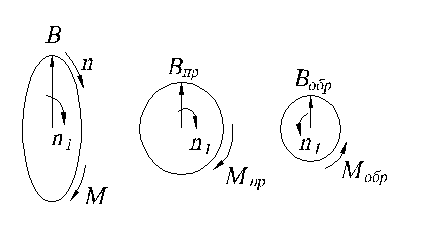 Прямое поле создает вращающий момент двигателя , а обратное - тормозящий момент . С увеличением эллиптичности поля за счет изменения углов сдвигов во времени и в пространстве или уменьшении магнитодвижущей силы одной из обмоток статора прямая составляющая поля и момента убывает, а обратная - возрастает. Уменьшение результирующего момента при неизменном моменте нагрузки приводит к снижению частоты вращения ротора. Когда полностью не выполняется хотя бы одно из условий кругового поля, т. е. , или , или , или , поле статора становится пульсирующим. В этом случае двигатель не развивает вращающего момента при неподвижном роторе. Для объяснения этого явления пульсирующее магнитное поле можно заменить двумя полями и , вращающимися в противоположные стороны с синхронной частотой . Амплитуды этих полей равны половине амплитуды пульсирующего поля.