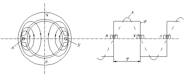 Рассмотрим сначала двухполюсную машину с простейшей сосредоточенной обмоткой, у которой все витки, включенные в фазу , находятся в пазах, расположенных в диаметральной плоскости (рис.2.8а) При протекании тока от начала фазы A к ее концу X возникает двухполюсный магнитный поток. При максимальном значении тока в катушке намагничивающая сила будет иметь максимальную величину . При условии равенства нулю магнитных сопротивлений участков магнитопровода распределение намагничивающей силы вдоль окружности статора будет иметь прямоугольную форму (рис.2.8б). Согласно разложению в ряд Фурье прямоугольной формы кривой при сосредоточенной обмотке, отклонение формы поля от синусоидальной велико, поэтому такая обмотка практически не используется.