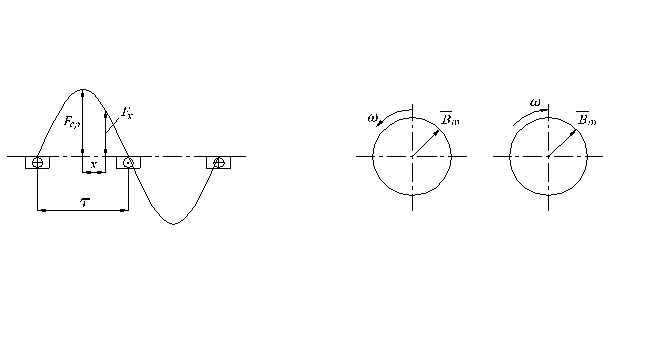 При питании переменным током однофазной обмотки возникает магнитное поле, пульсирующее во времени с частотой изменения тока. При синусоидальном распределении намагничивающей силы в каждой точке воздушного зазора, расположенной на расстоянии x от оси обмотки, будет действовать намагничивающая сила (НС), изменяющаяся по закону: