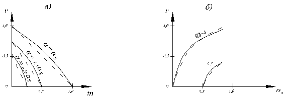 Рис. 2.33. Механические (а) и регулировочные (б) характеристики реального (сплошные линии) и идеального (пунктирные) асинхронного двухфазного двигателя при амплитудно-фазовом управлении