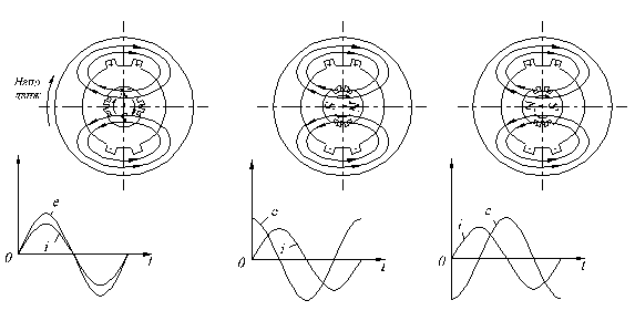В идеальном случае чисто индуктивной нагрузке генератора (3.3б) величина тока в фазе статора будет достигать своего максимального значения только тогда, когда соответствующий полюс ротора уйдет вперед на 90 градусов; при индуктивной нагрузке поток статора направлен вдоль полюса ротора против потока ротора. Следовательно, при индуктивной нагрузке НС тока статора стремится возбудить размагничивающий продольный поток.
