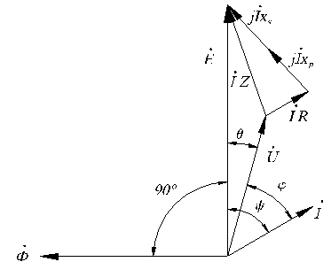 При принятых допущениях ЭДС , индуктируемая потоком ротора, складывается из напряжения на зажимах машины , напряжения , уравновешивающего ЭДС рассеяния , напряжения , уравновешивающего ЭДС реакции якоря и, наконец, из падения напряжения в активном сопротивлении статорной обмотки