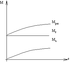 Если нагрузочный момент больше Мг (рис.3.14), то двигатель перейдет в асинхронный режим работы, т.е. появится дополнительный асинхронный момент Ма. Асинхронный момент Ма есть результат взаимодействия вращающегося магнитного поля с вихревыми токами, которые индуктируются этим полем в сердечнике ротора. Т к. ротор имеет большое активное сопротивление, то характеристика Ма=f(s) практически линейна и асинхронный гистерезисный момент максимален при s=1.