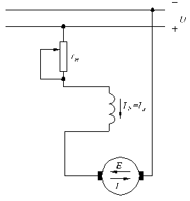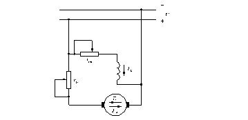 Регулировочный реостат rр.в позволяет изменять ток возбуждения двигателя Iв и тем самым его магнитный поток. Согласно выражению ω=f(Ф) при этом будет изменяться и скорость вращения двигателя. В цепь обмотки возбуждения никаких выключателей и предохранителей не устанавливают, т.к. при разрыве этой цепи и небольшой нагрузке на валу скорость двигателя резко возрастает (он идет в "разнос"). При этом сильно увеличивается ток якоря и возникает круговой огонь на коллекторе машины.