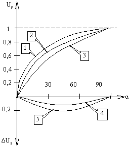 На рис. 5.4 показаны зависимости Us=f(α) οри холостом ходе (кривая 1) и при нагрузке (кривые 2 и 3), построенные по вышеуказанным формулам. При этом кривые 2 и 3 соответствуют значениям As, равным 0,25 и 1. Из этих кривых следует, что при нагрузке погрешность поворотного трансформатора может быть весьма значительной. Зависимости амплитудной погрешности ΔUs от угла поворота α для указанных значений модуля комплекса As изображены на рисунке кривыми 4 и 5.