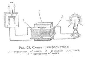 принципиальная схема трансформатора; для ясности обмотки его помещены на разных