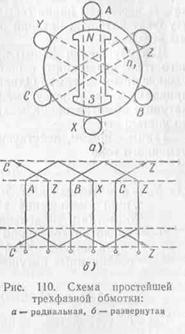 трехфазная обмотка и ее развернутая схема. Эта обмотка состоит из трех