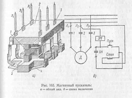 рис. 165, б. Контаты магнитного пускателя 1, 2, 3 нормально разомкнуты. Электромагнит