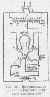 выпрямитель (рис. 203) имеет колбу из молибденового стекла, из которой выкачан