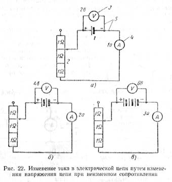 аккумулятора (рис. 22, 6). При том же сопротивлении в цепи — 2 Ом — амперметр
