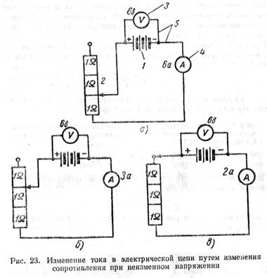 сопротивление в цепи, равное 1 Ом (рис. 23, а). Тогда амперметр покажет 6 А. Увеличим реостатом