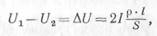 Потеря напряжения равна току, протекающему по проводам линии, умноженному на сопротивление проводов: