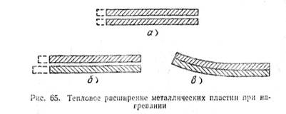 с никелем) и латуни. При нагреве пластина изгибается в сторону металла с меньшим тепловым расширением (рис. 65, в).