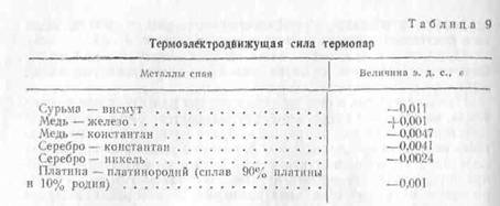 пар металлов при разности температур спая и окружающей среды 100°С (табл. 9).