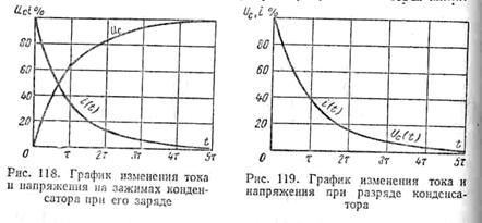 На рис, 118 представлен график изменения тока и напряжения на зажимах конденсатора при его заряде.