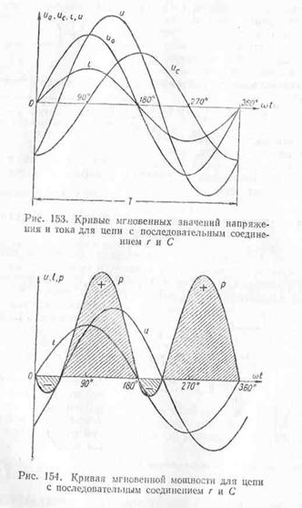 мгновенных значений напряжений и тока для последовательного соединения r и С. Кривая мгновенной мощности для этого случая
