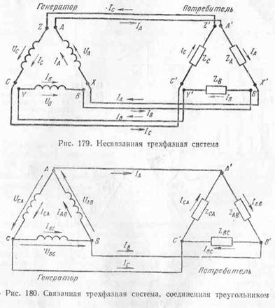 рис. 180, линейное напряжение создает каждая фазная обмотка. У потребителя, соединенного треугольником, линейное