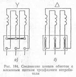 треугольником (рис. 184, б). Тогда на обмотку каждой фазы двигателя