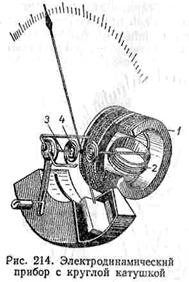 действия электродинамических приборов основан на взаимодействии магнитных полей двух катушек одной, неподвижно закрепленной, и другой, сидящей на оси и могущей поворачиваться. На рис. 214 показано устройство электродинамического прибора. Катушка 1 (здесь — состоящая из двух половин) неподвижно закреплена. К подвижной катушке 2, укрепленной на оси прибора 3, ток подводится через спиральные пружины 4, которые одновременно служат для создания противодействующего момента. При пропускании тока по виткам обеих катушек они создадут магнитные поля, которые, взаимодействуя между собой, будут стремиться повернуть катушку 2 так, чтобы ее магнитное поле и поле катушки 1 совпадали по направлению. Кроме круглых катушек, встречаются конструкции приборов с прямоугольными катушками. Магнитное поле каждой катушки зависит от тока, поэтому сила взаимодействия обеих катушек пропорциональна квадрату тока. Следовательно, шкала прибора неравномерна. Успокоение приборов этой системы воздушное, так как применение тормоза вызвало бы искажение показаний прибора. Это объясняется тем, что собственные магнитные поля катушек очень малы и сильное поле постоянного магнита электромагнитного тормоза оказывало бы влияние на работу прибора.