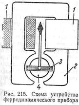 изменение направления тока в обеих катушках не меняет направления силы взаимодействия. Поэтому электродинамические приборы применяются в цепях как постоянного, так и переменного тока. В цепях переменного тока приборы этой системы показывают действующее значение измеряемой величины. Точность электродинамических приборов I велика (класс точности — 0,2—0,5), и поэтому они нашли себе применение как контрольные приборы для измерений на переменном токе. К недостаткам приборов нужно отнести достаточно большое потребление мощности, составляющее в амперметрах 5—10 вт, в вольтметрах — 7—15 вт, чувствительность к перегрузкам и влияние на показание прибора внешних магнитных полей вследствие слабого собственного поля прибора. При перегрузках прибора спиральные пружинки теряют упругость и могут перегореть. Другой разновидностью электродинамических приборов являются ферродинамические приборы (рис. 215).