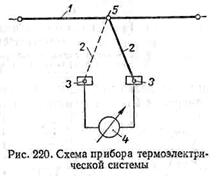 металлической нити 1, к которой припаяны или приварены два разнородных проводника 2, например железо и константен. Свободные концы проводников 2 присоединены к металлическим колодкам 3, хорошо отводящим тепло. К колодкам подключается магнитоэлектрический измерительный прибор 4.