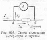 определение величины тока. Чтобы ток в цепи при включении амперметра не изменился, необходимо сопротивление его обмотки делать очень малым. Для этого обмотку амперметра делают из небольшого числа витков толстой проволоки. Чтобы расширить пределы измерения амперметра, применяют шунты. Шунты представляют собой манганиновые пластины или стержни, впаянные в медные или латунные наконечники (рис. 226). Шунт включается в цепь последовательно. Параллельно ему включается амперметр (рис.227).