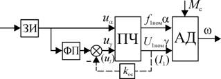 статор АД подключен к преобразователю частоты (ПЧ), имеющему два независимых