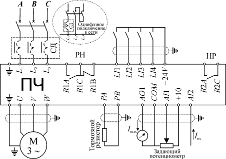 Преобразователь может питаться как от трехфазной, так и от однофазной сети. Для