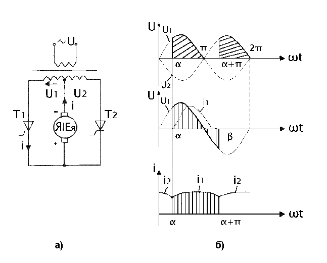 регулирование напряжения на якоре двигателя осуществляется тиристорами Т1 и Т2.В момент времени, определяемый углом