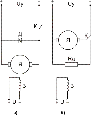 Если к валу двигателя приложен статический момент нагрузки, приводящий к механическому торможению двигателя во время паузы, то возможно применение схемы (рис.2.14,а), в которой ключ К в течение одной части цикла подключает якорь непосредственно к источнику питания, создавая положительный момент (разгон), в течение же другой части – отключает якорь от источника питания (торможение). Если двигатель работает без или с малой статической нагрузкой, то возможно применение электрического торможения (динамического или противовключением) во время паузы. Например, в схеме на рис. 2.14,б ключ К переключает во время паузы якорь на сопротивление Rд для осу¬ществления динамического торможения. В качестве ключевых элементов в современных схемах используются транзисторы или тиристоры; контактные электромагнитные реле, ввиду их низкого быстродействия, практически не применяются.