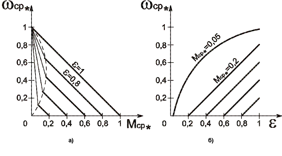 Механические характеристики – линейные и начинаются из одной общей точки х.х.; жесткость механических характеристик уменьшается при уменьшении ε. Регулировочные характеристики – нелинейные; регулирование возможно только при Mcp*!!=0.