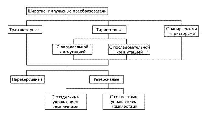 На рис.2.16 приведена классификация основных типов широтно-импульсных преобразователей. Широтно-импульсные преобразователи состоят из силовой части, выполняемой на транзисторах, тиристорах или запираемых тиристорах, и схемы управления; питаются они от сети постоянного тока.
