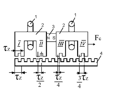 Поверхность полюсов ротора I—IV также зубчатая. Зубцовые деления τz ротора и статора равны. Зубцы двух полюсов в пределах одного магнитопровода ротора сдвинуты по отношению к зубцам статора на ½ зубцового деления, одного магнитопровода по отношению к другому — на ¼ зубцового деления. В результате зубцы всех полюсов ротора по-разному ориентированы относительно зубцов статора, но магнитное сопротивление потоку подмагничивания не зависит от перемещения якоря.