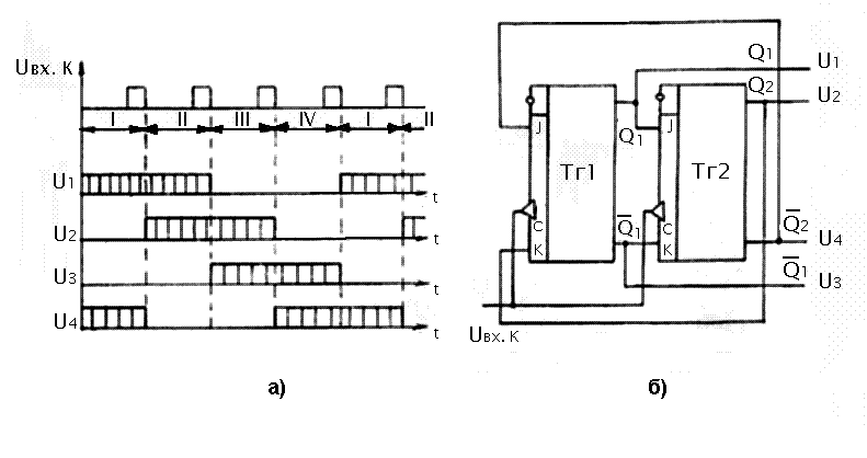 Распределители импульсов бывают аппаратные (исторически появились раньше) и программные. Аппаратные распределители обычно реализуются на базе дискретных полупроводниковых элементов или интегральных микросхем в виде сдвигающих регистров или счетчиков с дешифратором. На рис. 4.6,б показана схема распределителя импульсов, выполненного в виде сдвигающего регистра на двух JK-триггерах и позволяющего реализовать временную диаграмму импульсов, представленную на рис. 4.6,а.