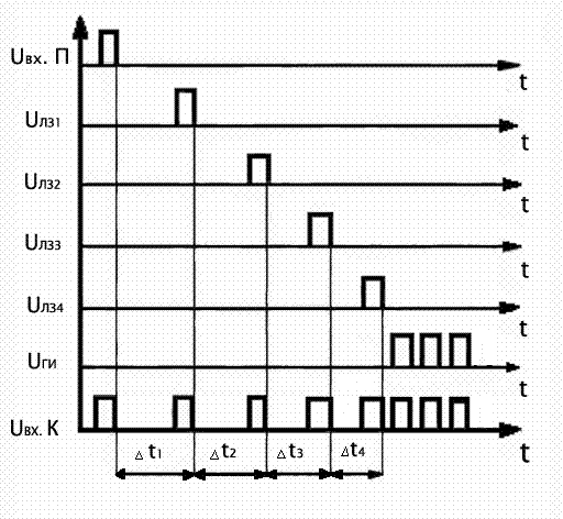 В простейших случаях преобразователи реализуются аппаратным способом на дискретных или интегральных элементах для каждого конкретного режима. На рис. 4.7,а показана схема преобразователя, позволяющего реализовать закон нарастания частоты импульсов при разгоне, приведенный на рис. 4.7,б. Преобразователь реализован на линиях задержки ЛЗ1-ЛЗ4, уставки ЛЗ Δt1>Δt2>Δt3>Δt4, значение Δt1 соответствует частоте приемистости. Генератор импульсов ГИ формирует импульсы заданной предельной частоты.