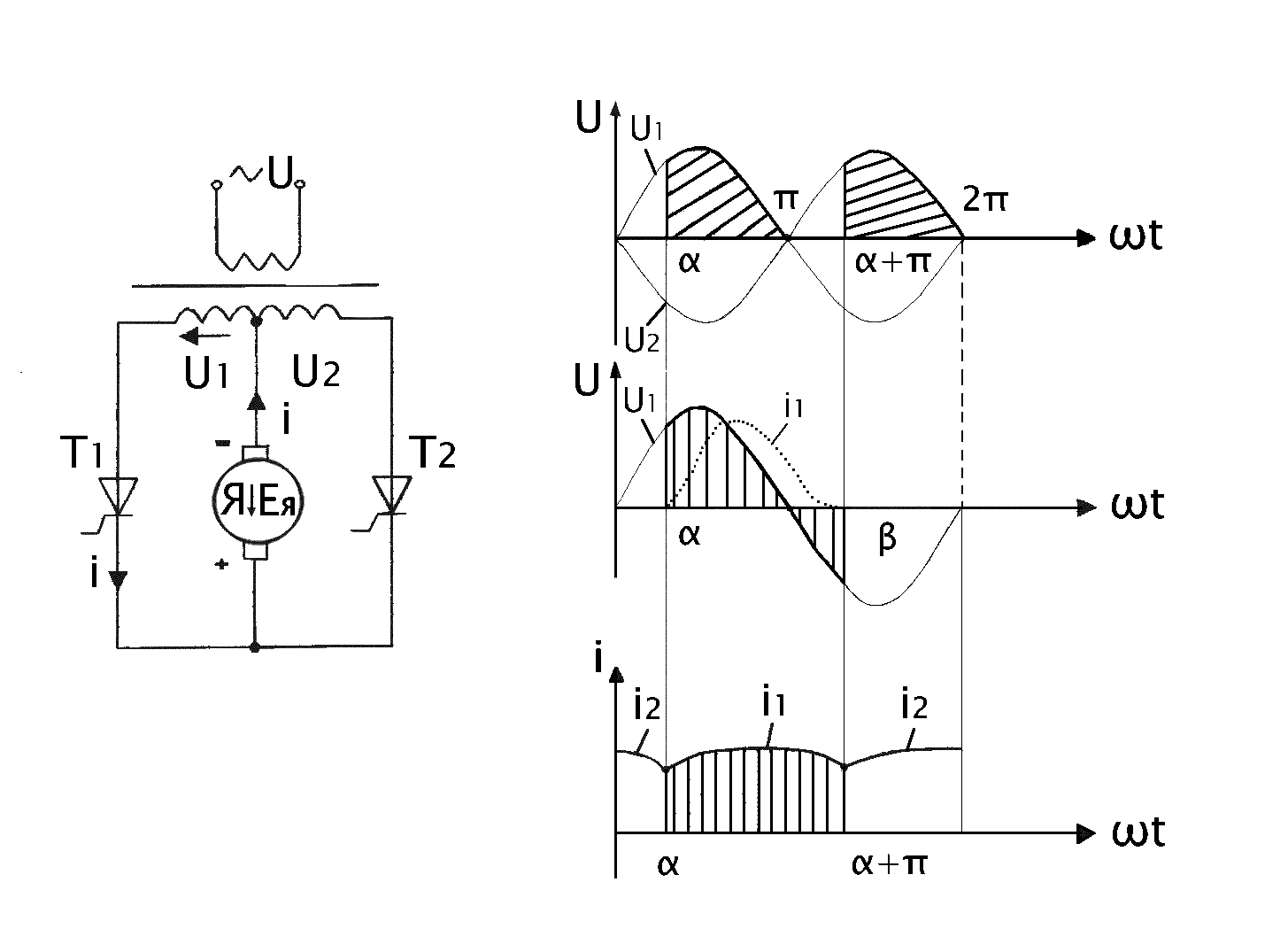 Принцип работы простейшего двухфазного управляемого выпрямителя